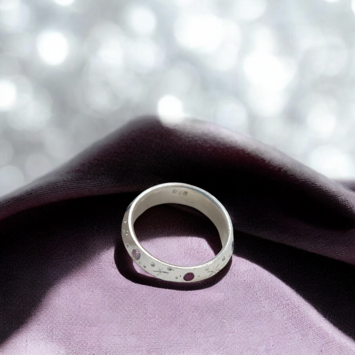Anillo Eternal Destellos de plata 950, concebido como una pieza simbólica y de fuerte carga energética. El diseño incorpora doce pequeñas piedras semipreciosas engastadas a lo largo del anillo, seis a cada lado, acompañadas por grabados realizados a mano con buril que evocan destellos y formas estrelladas.