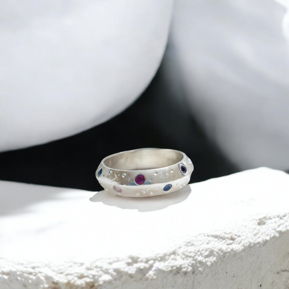 Anillo realizado en plata 950, con doce piedras semipreciosas engastadas a lo largo del diseño.