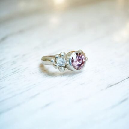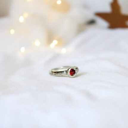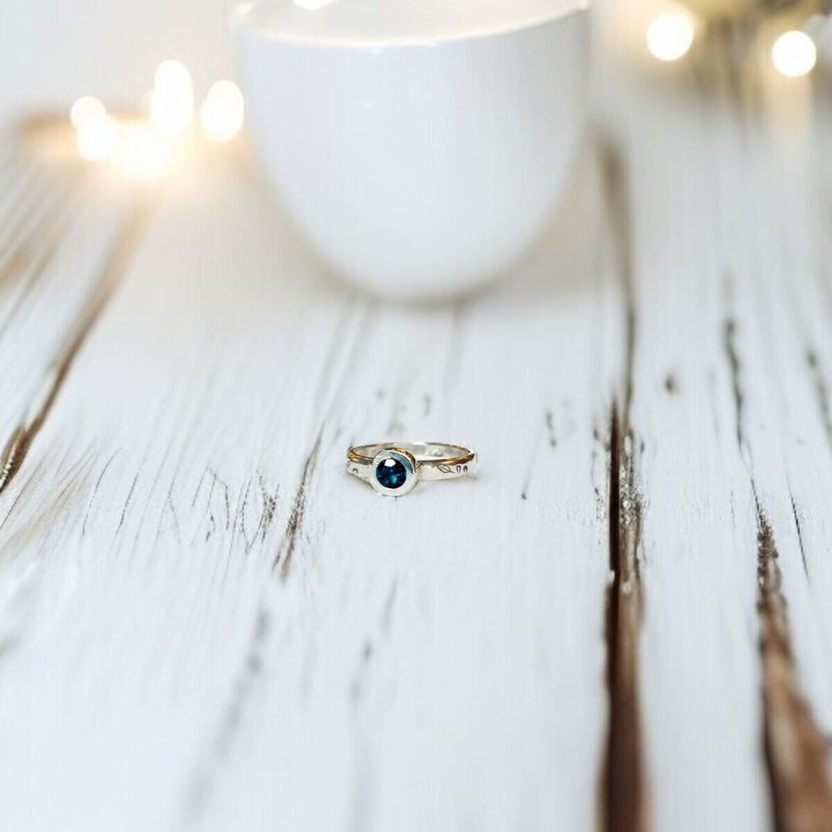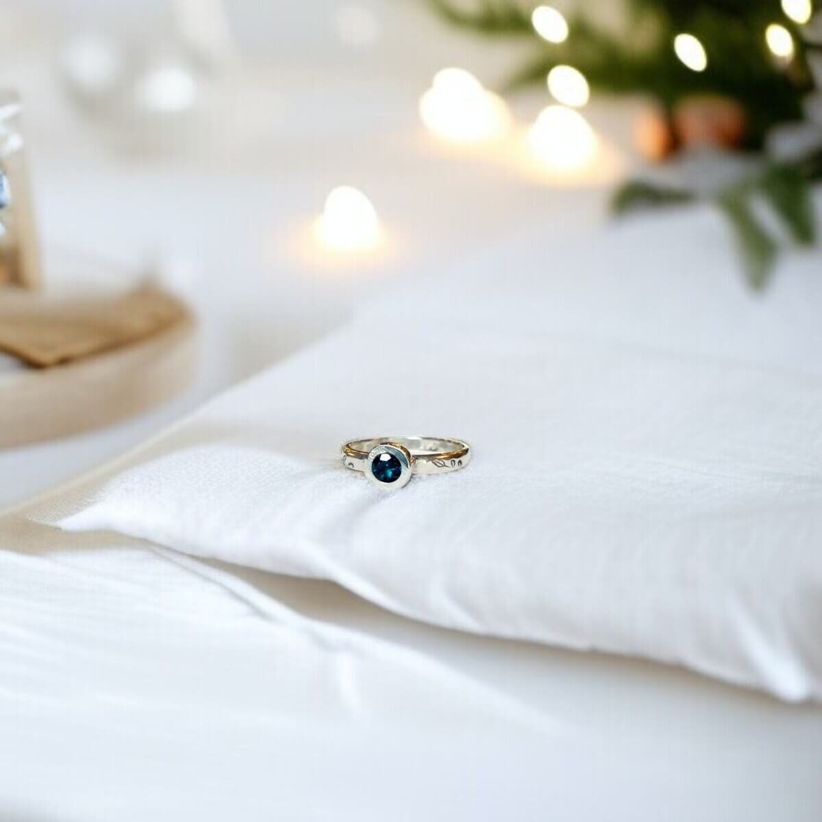 Anillo leaf de plata con topacio London Blue, un diseño delicado inspirado en la naturaleza. Hojas grabadas a lo largo de la argolla enmarcan una piedra central de 4 mm.
