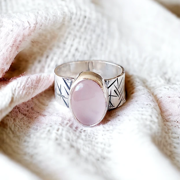 Anillo Rayas con Cuarzo Rosa. Este anillo, elaborado en plata genuina libre de níquel, es la elección perfecta para quienes buscan una joya que combine elegancia y delicadeza. El cuarzo rosado, conocido por sus propiedades calmantes y su suave tonalidad rosa, se convierte en el protagonista de esta pieza única.