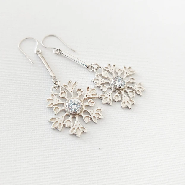 Aros largos con un elegante diseño de copo de nieve, elaborados en plata genuina.