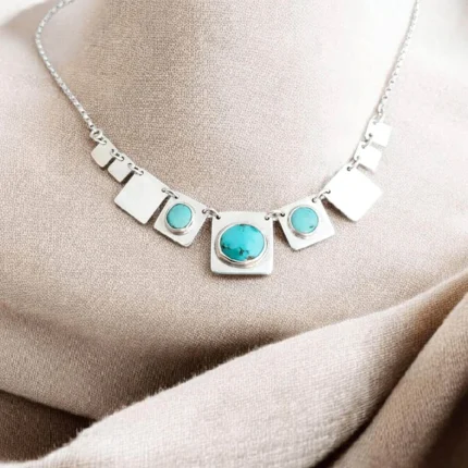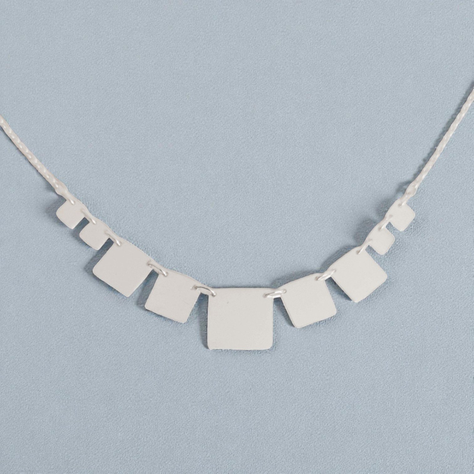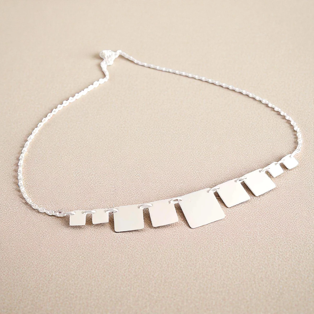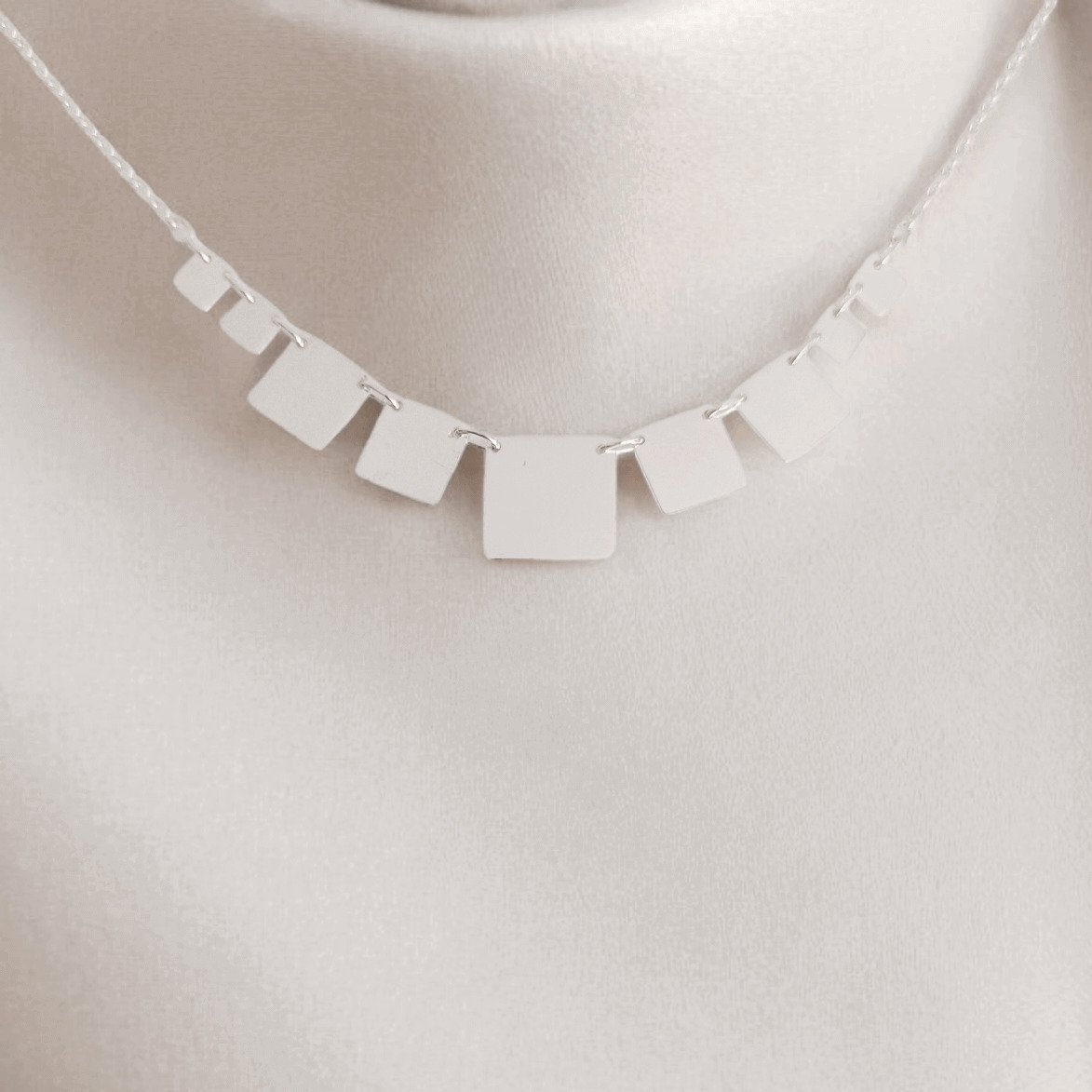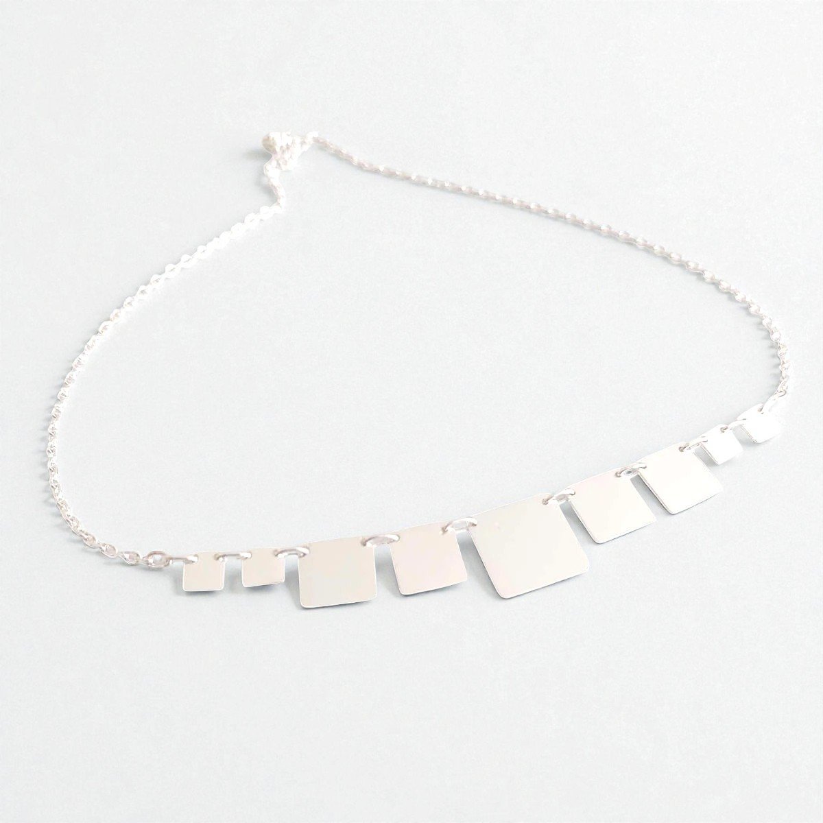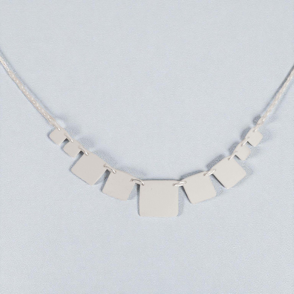 Un collar cuidadosamente trabajado a mano, compuesto por nueve placas de plata 950 perfectamente alineadas, creando un diseño limpio, equilibrado y elegante.